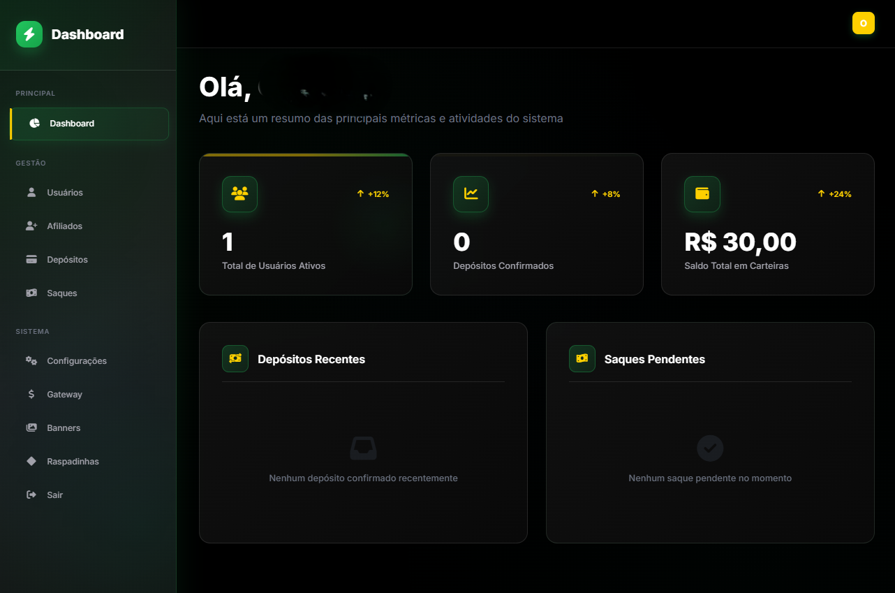Adquira agora e lance sua operação de raspadinhas digitais com PIX, afiliados e um painel admin robusto.