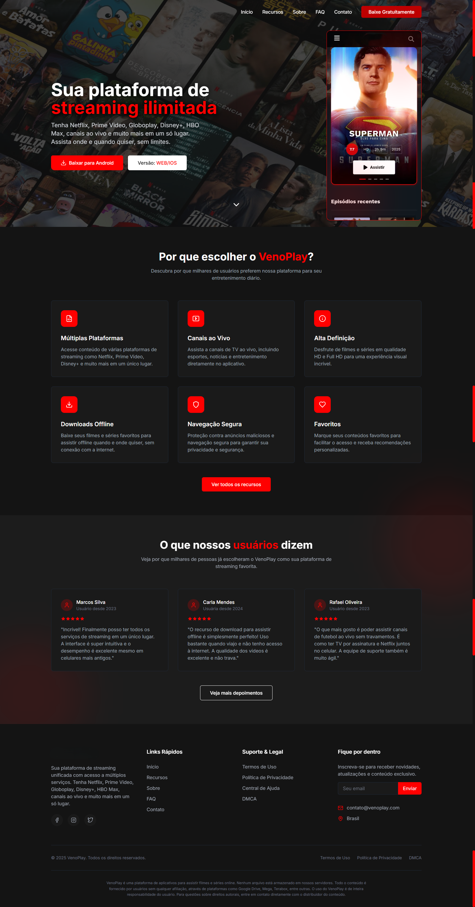 - Links rápidos e legais (Termos, Privacidade, FAQ, DMCA).