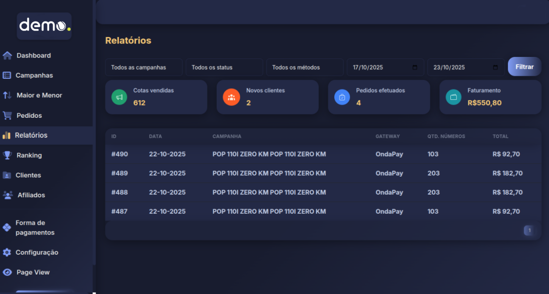 - Gestão completa de rifas: crie campanhas, defina prêmios, regras e prazos.
